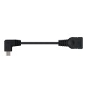 Cable USB 2.0 OTG con conector acodado tipo Micro USB B macho en un extremo y tipo USB A hembra en el otro.