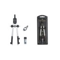 Compás de ajuste rápido con tornillo central, articulaciones en ambos brazos y accesorios de recambio. Con adaptador universal. Se presenta en estuche con tapa transparente.