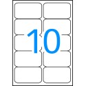 Etiquetas blancas cantos romos tamaño 99,1 x 57 mm con adhesivo permanente. Este pack incluye 20 hojas con 10 etiquetas por hoja, lo que suma un total de 200 etiquetas. Las etiquetas están hechas de poliéster con acabado mate, lo que las hace resistentes a la intemperie y a la corrosión ambiental. Además, estas etiquetas de poliéster soportan condiciones extremas, resistiendo temperaturas de entre -20°C hasta +100°C. Son ideales para marcaje de elementos y señalizaciones exteriores, así como envíos. Por último, cabe destacar que estas etiquetas ofrecen una excelente calidad de impresión en impresoras láser o fotocopiadoras.