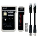 Testeador profesional para testear cables RJ11 / RJ12 / RJ45 y coaxial. Se pueden realizar comprobaciones de cables (RJ45, RJ11, BNC) con la unidad remota a una distancia de hasta 182,88 metros de la unidad principal. Indicadores LED para las conexiones y fallos.